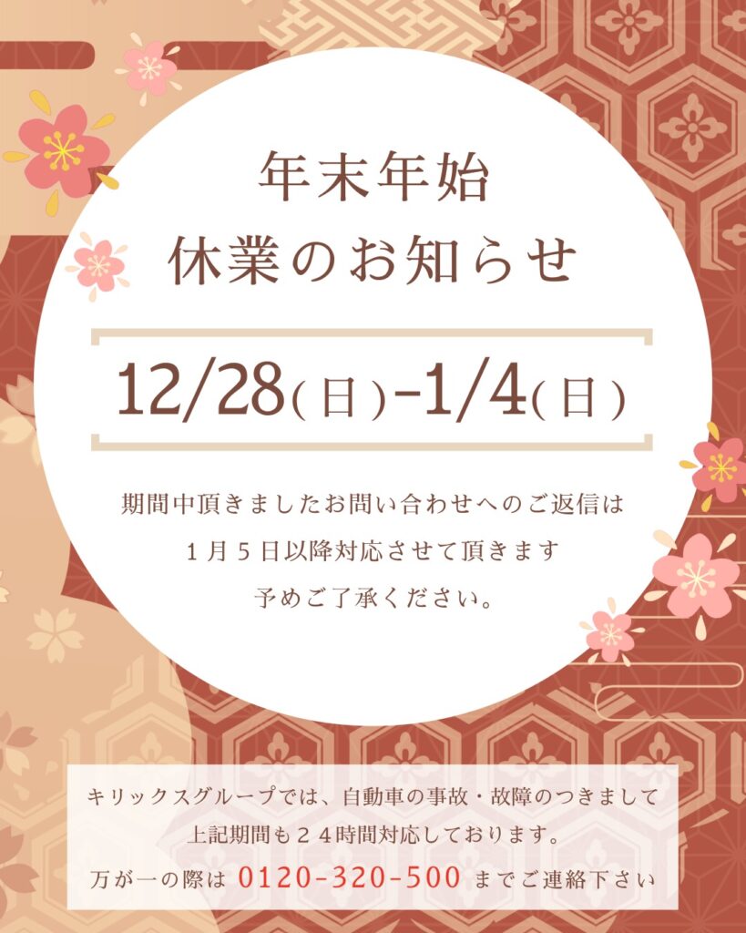 ※キリックスグループの自動車部門(キリックスリース・トヨタモビリティ東名古屋・キリンダム・オートプラザキリックス)などの車両事故等の対応は年末年始問わず実施をいたしております。